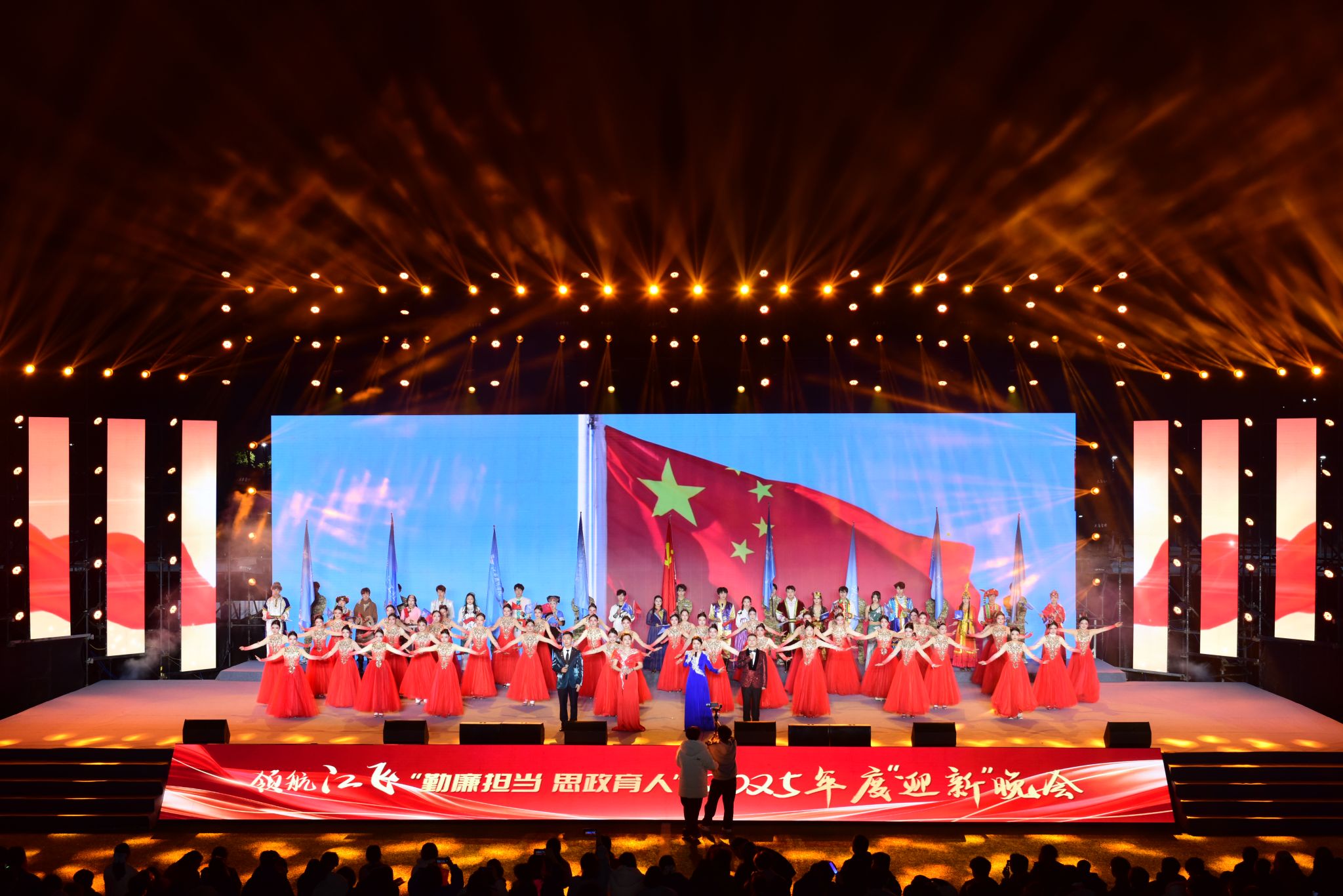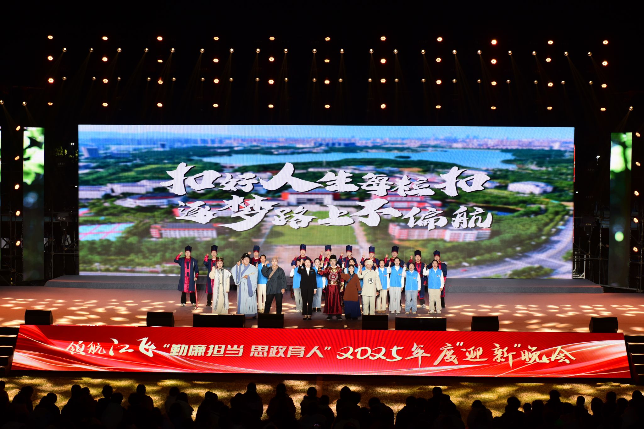 无人机表演率先点燃全场热情。晚会在激昂的《强军战歌》大合唱中正式开幕。诗朗诵《江飞正青春》抒发了对学校的深厚情感与美好祝愿,歌舞《人民的名义》诠释了立德树人的初心使命。《立足三尺讲台 践行教育家精神》以铮铮誓言表达了对教育事业的坚守。快板《廉政花开结硕果》以通俗活泼的形式传递勤廉理念,原创歌曲《爱如莫言》用旋律诉说着师恩情深。情景剧《站在历史的画廊回望你——况钟》贯通古今,激发奋进力量,舞蹈《桃李芬芳》《幸福江飞飞起来》则以优美舞姿展现艺术魅力。