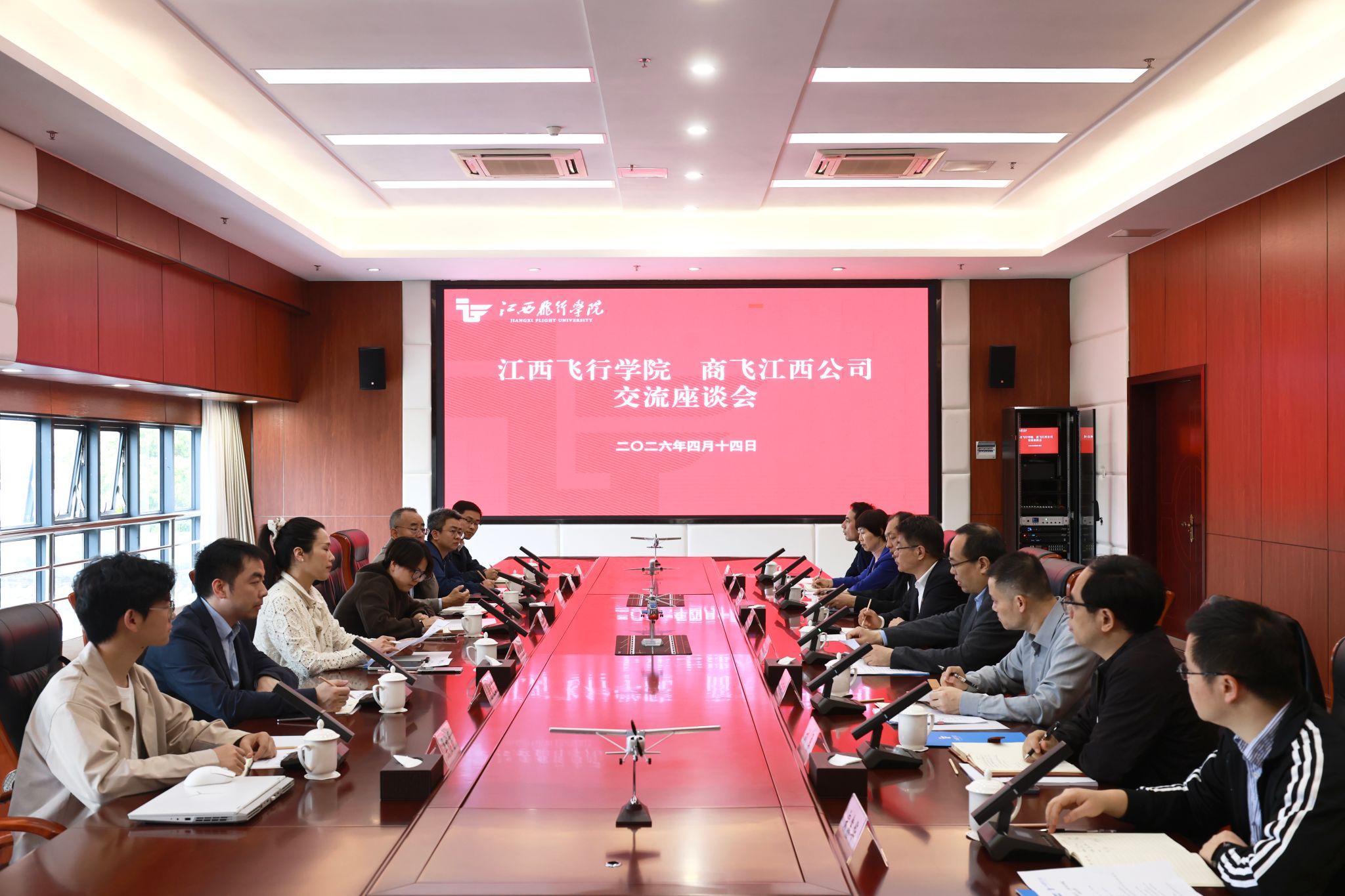 商飞江西公司工程技术中心、党群与人力部负责人,学校科研处、飞行技术学院、航空机电工程学院负责人等参与交流。