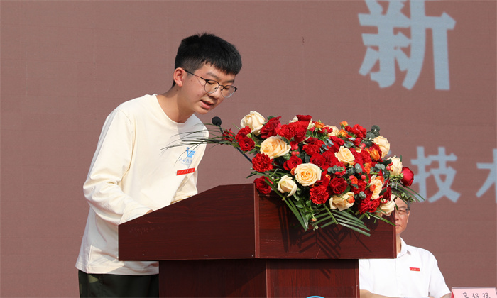 典礼上,党委书记陈震等在主席台就座的嘉宾为新生代表佩戴校徽。新生代表2024级飞行技术学院飞行器制造工程4班袁杨亮,教师代表2024年度国家自然科学基金项目获得者、机场学院郭观明在典礼仪式上发言。