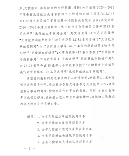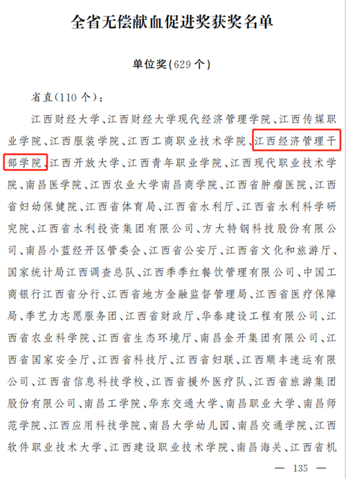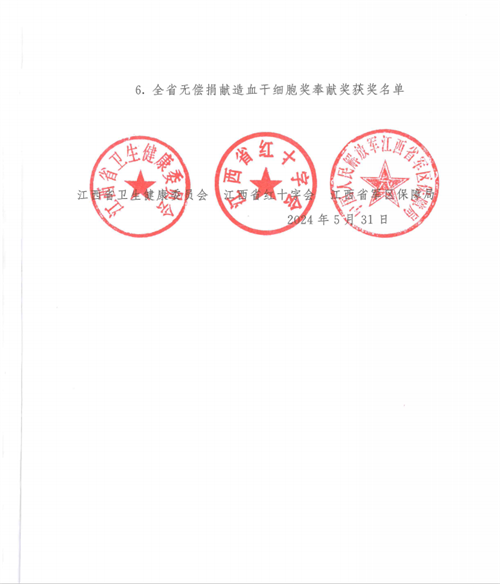 近日,省卫生健康委员会、省红十字会、省军区保障局印发《关于表彰2020-2022年度全省无偿献血先进单位和个人的决定》(赣卫医字〔2024〕22号),对积极参与无偿献血的先进单位和个人进行表彰,我校荣获全省无偿献血促进奖单位奖。