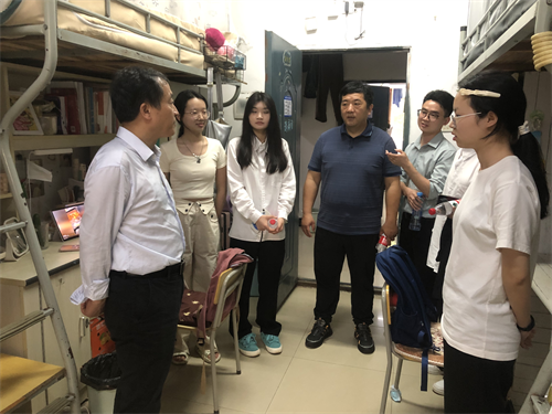 肖鸿晶走访了学生3栋2间,了解同学们在寝室的情况。肯定了学生寝室文化建设,表扬了3栋获得卫生流动红旗的寝室。走访6栋2间寝室,“没有阳台,衣服晾在哪里?”“寝室设备报修怎样?”,学生对学校推行钉钉报修系统非常满意,学生表示“当天报修,第二就能修理,大大提高了效率。”