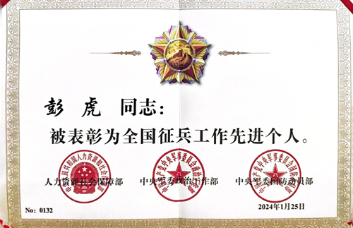 【喜报】彭虎同志被表彰为全国征兵工作先进个人