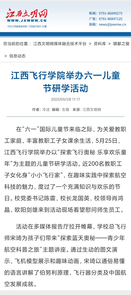 近日,江西文明网报道,江西飞行学院举办“六一”国际儿童节航空科普研学活动,详情如下: