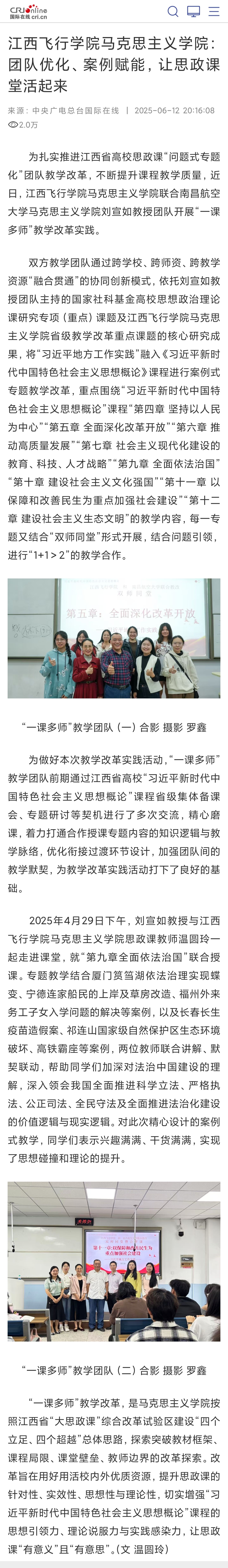 近日,央广国际在线报道,江西飞行学院马克思主义学院:团队优化、案例赋能,让思政课堂活起来详情如下