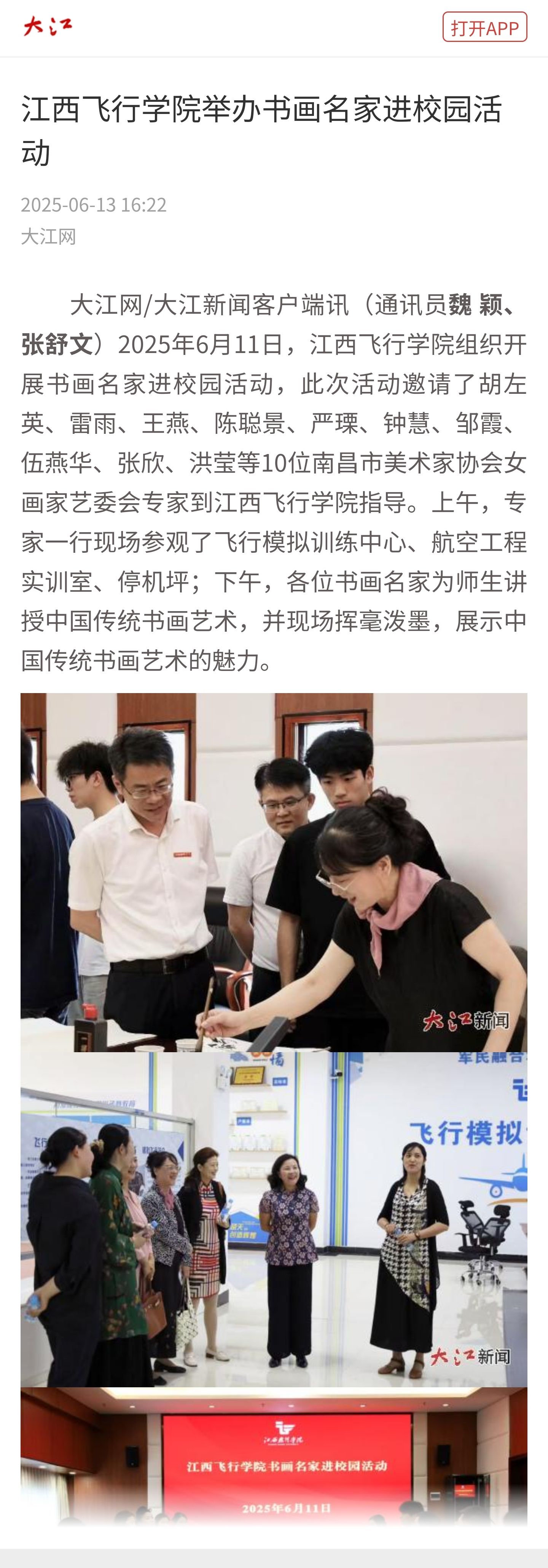 近日,大江网报道,江西飞行学院举办书画名家进校园活动详情如下
