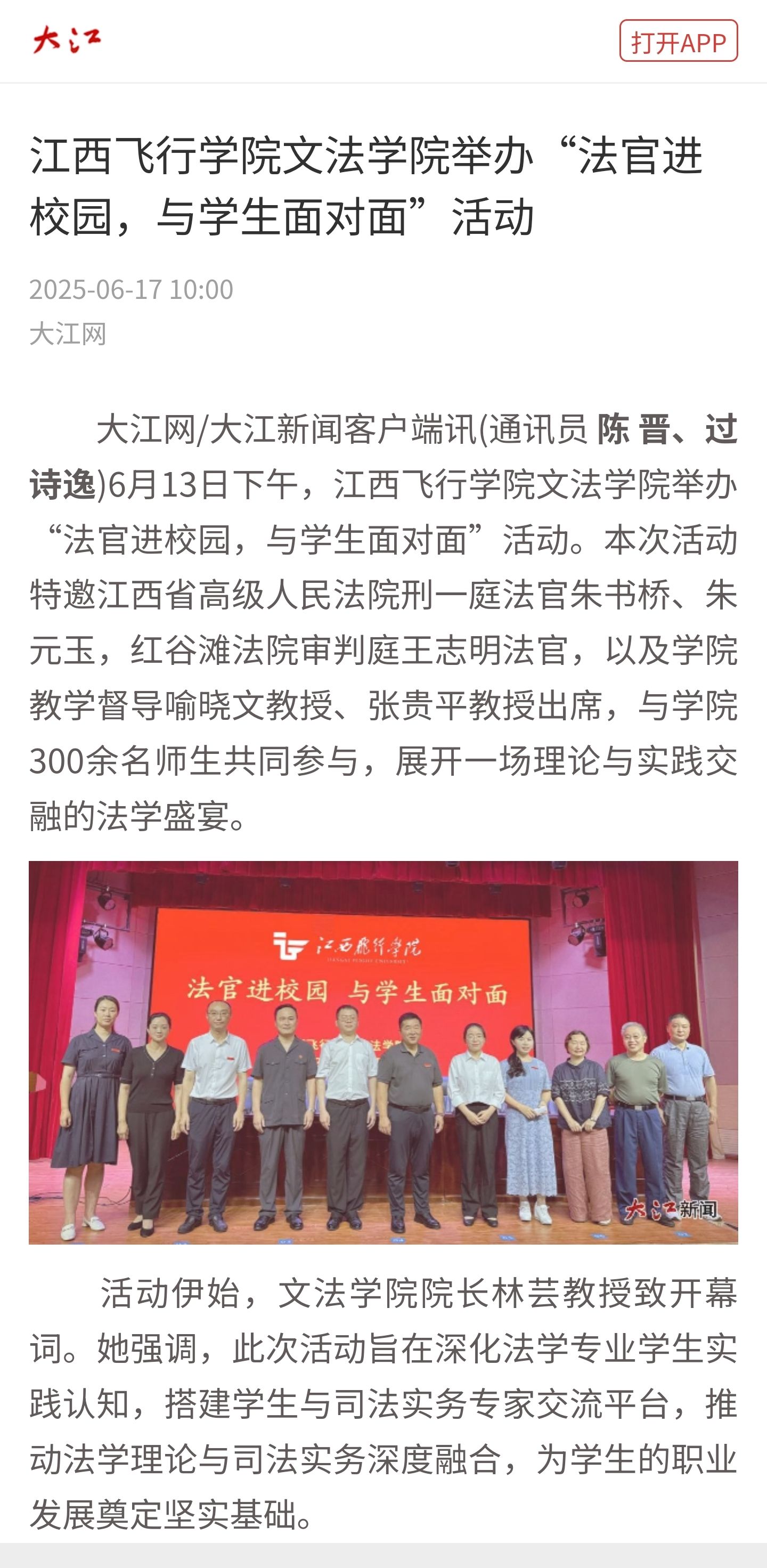 大江网:江西飞行学院文法学院举办“法官进校园,与学生面对面”活动