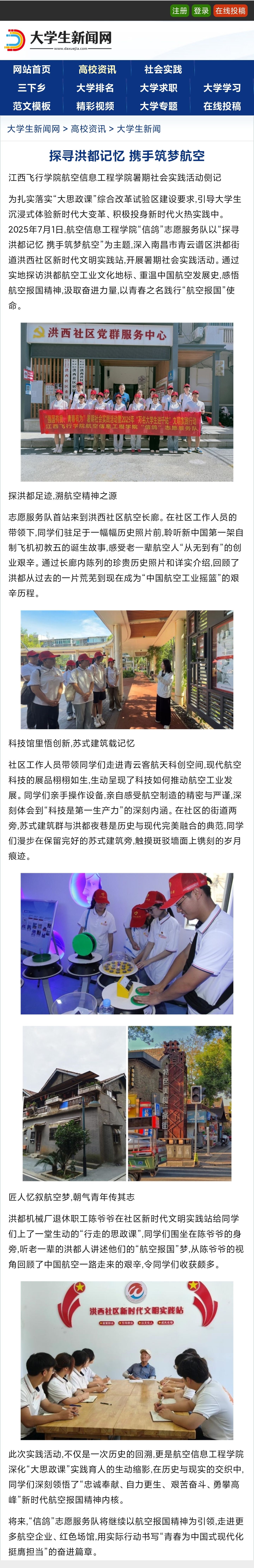 近日,大学生新闻网报道,探寻洪都记忆 携手筑梦航空--江西飞行学院航空信息工程学院暑期社会实践活动侧记详情如下
