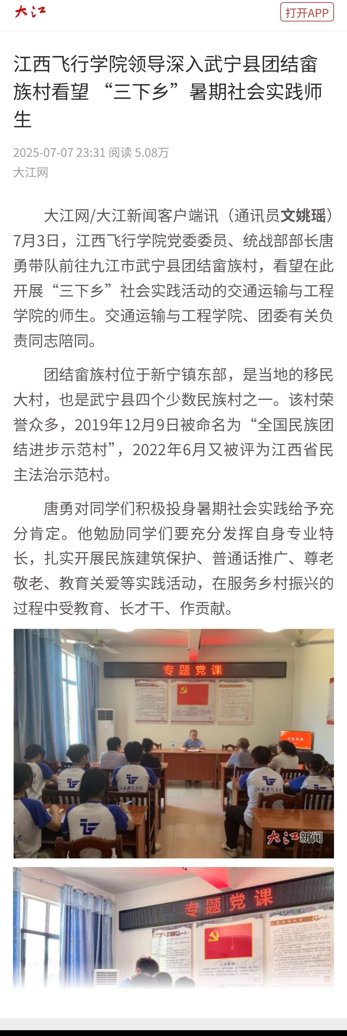 近日,大江网报道,江西飞行学院领导深入武宁县团结畲族村看望 “三下乡”暑期社会实践师生详情如下: