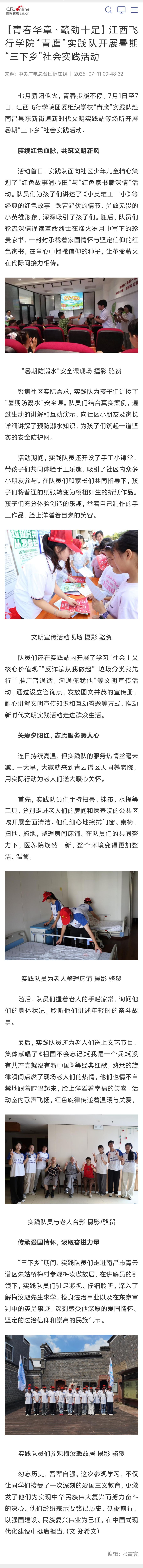 近日,央广国际在线报道,【青春华章·赣劲十足】江西飞行学院“青鹰”实践队开展暑期“三下乡”社会实践活动