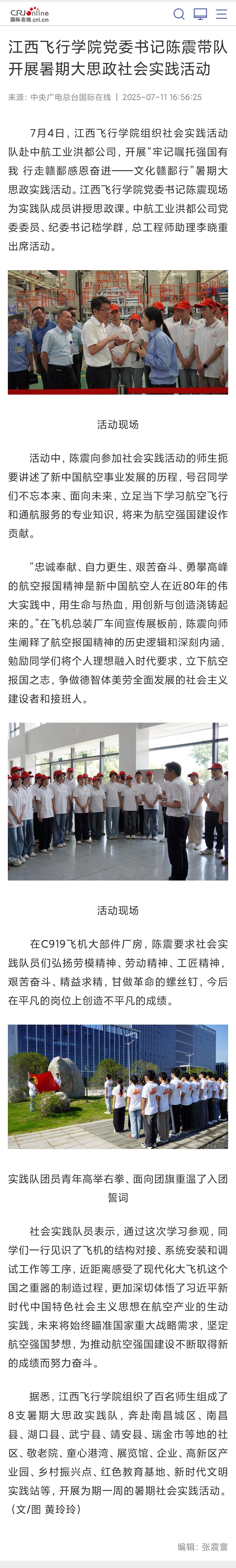 近日,央广国际在线报道,江西飞行学院党委书记陈震带队开展暑期大思政社会实践活动详情如下: