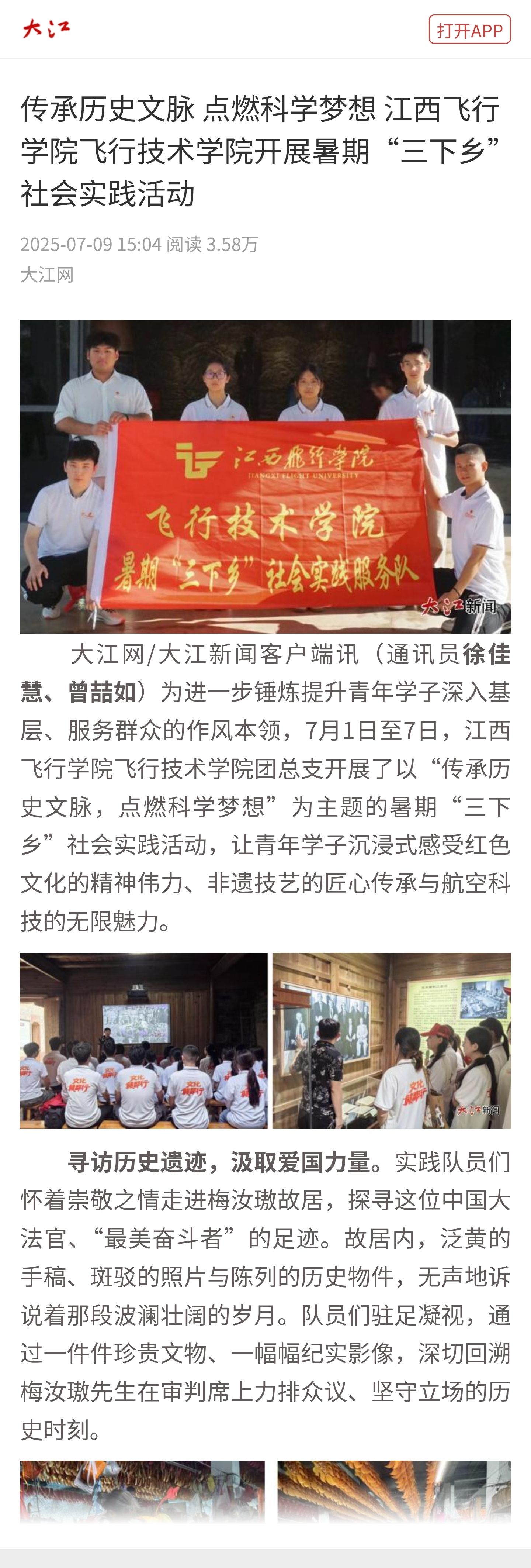 近日,大江新闻网报道,传承历史文脉 点燃科学梦想 江西飞行学院飞行技术学院开展暑期“三下乡”社会实践活动情如下:
