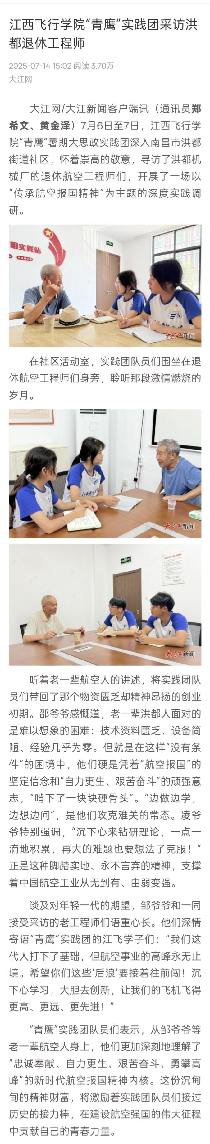大江网:江西飞行学院“青鹰”实践团采访洪都退休工程师