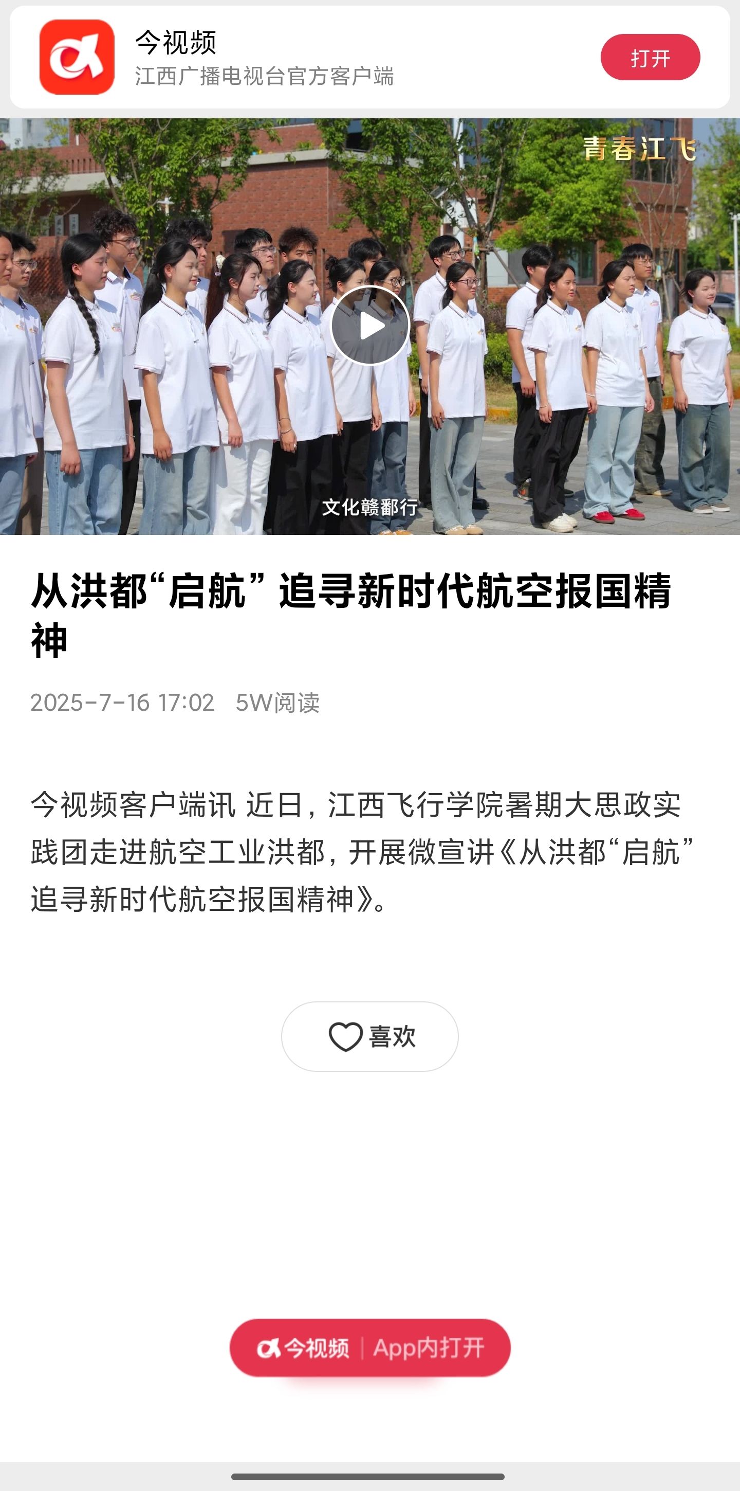 近日,今视频报道,从洪都“启航” 追寻新时代航空报国精神详情如下: