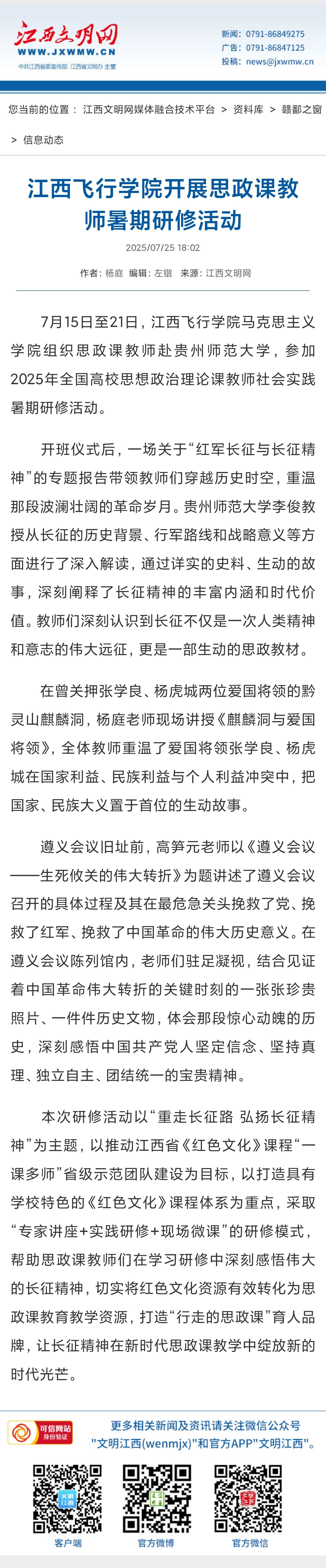 近日,江西文明网报道,江西飞行学院开展思政课教师暑期研修活动详情如下: