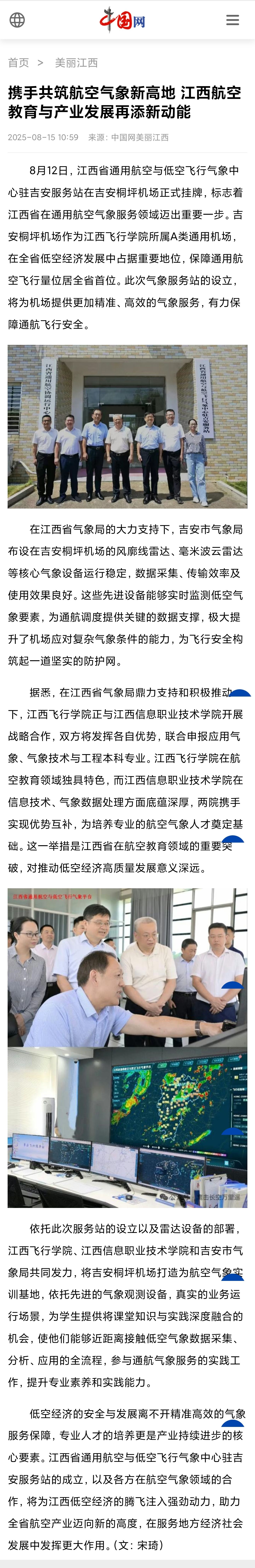 近日,中国网报道,携手共筑航空气象新高地 江西航空教育与产业发展再添新动能详情如下: