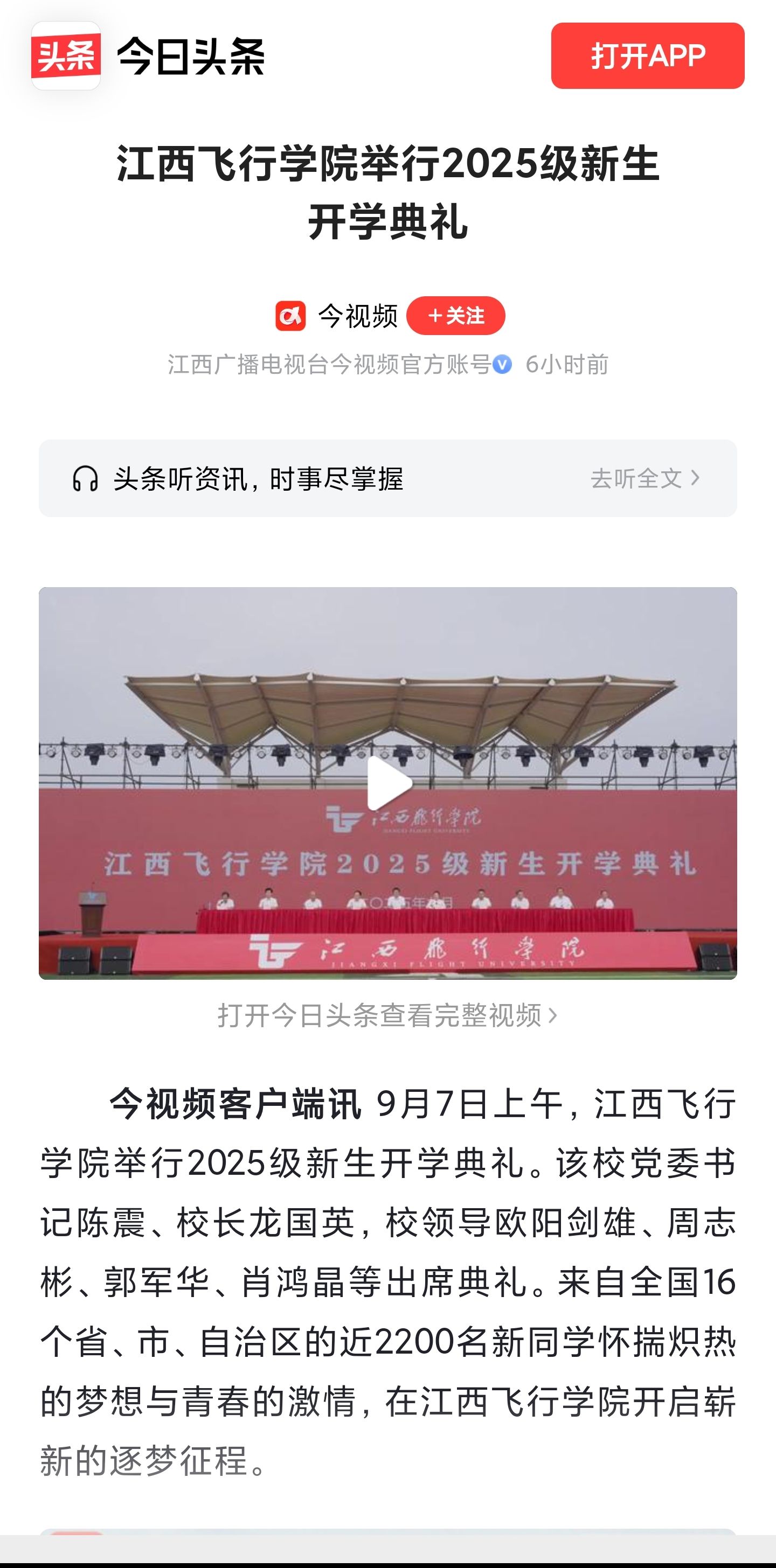 近日,今日头条报道江西飞行学院举行2025级新生开学典礼详情如下: