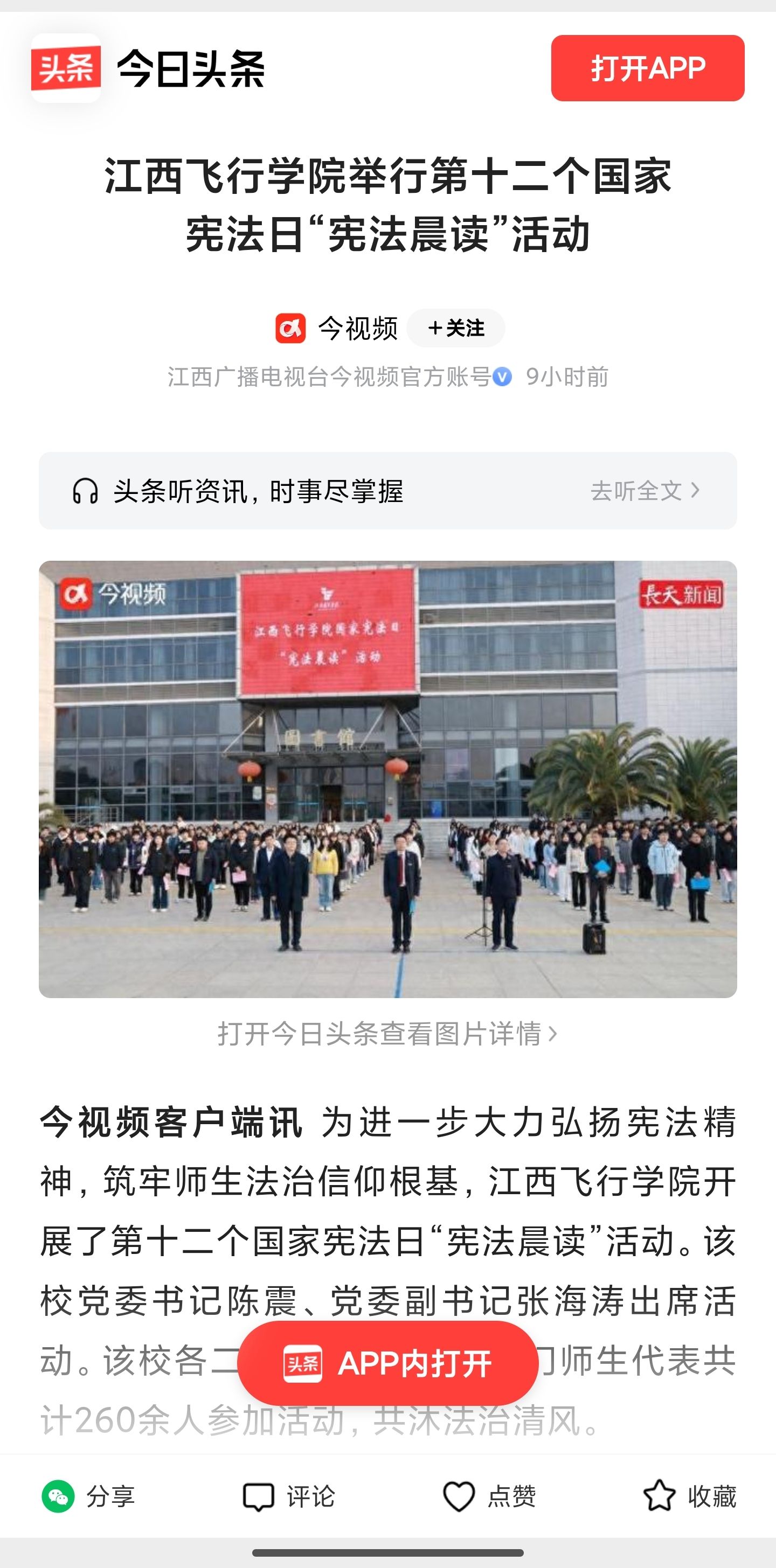 近日,今日头条报道,江西飞行学院举行第十二个国家宪法日“宪法晨读”活动详情如下: