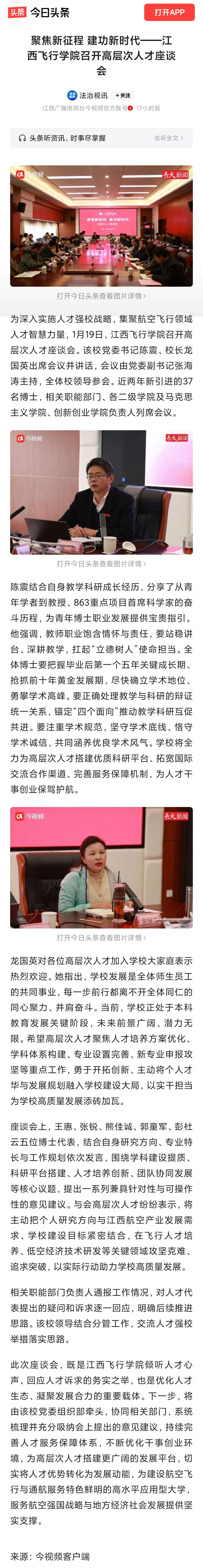 近日,今日头条报道,聚焦新征程 建功新时代——江西飞行学院召开高层次人才座谈会详情如下: