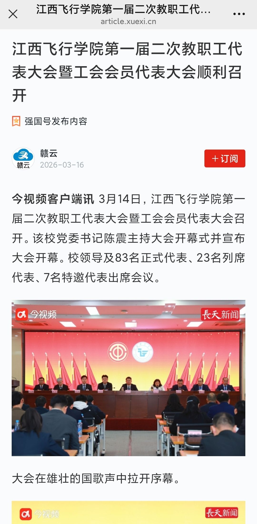 近日,学习强国报道,江西飞行学院第一届二次教职工代表大会暨工会会员代表大会顺利召开详情如下: