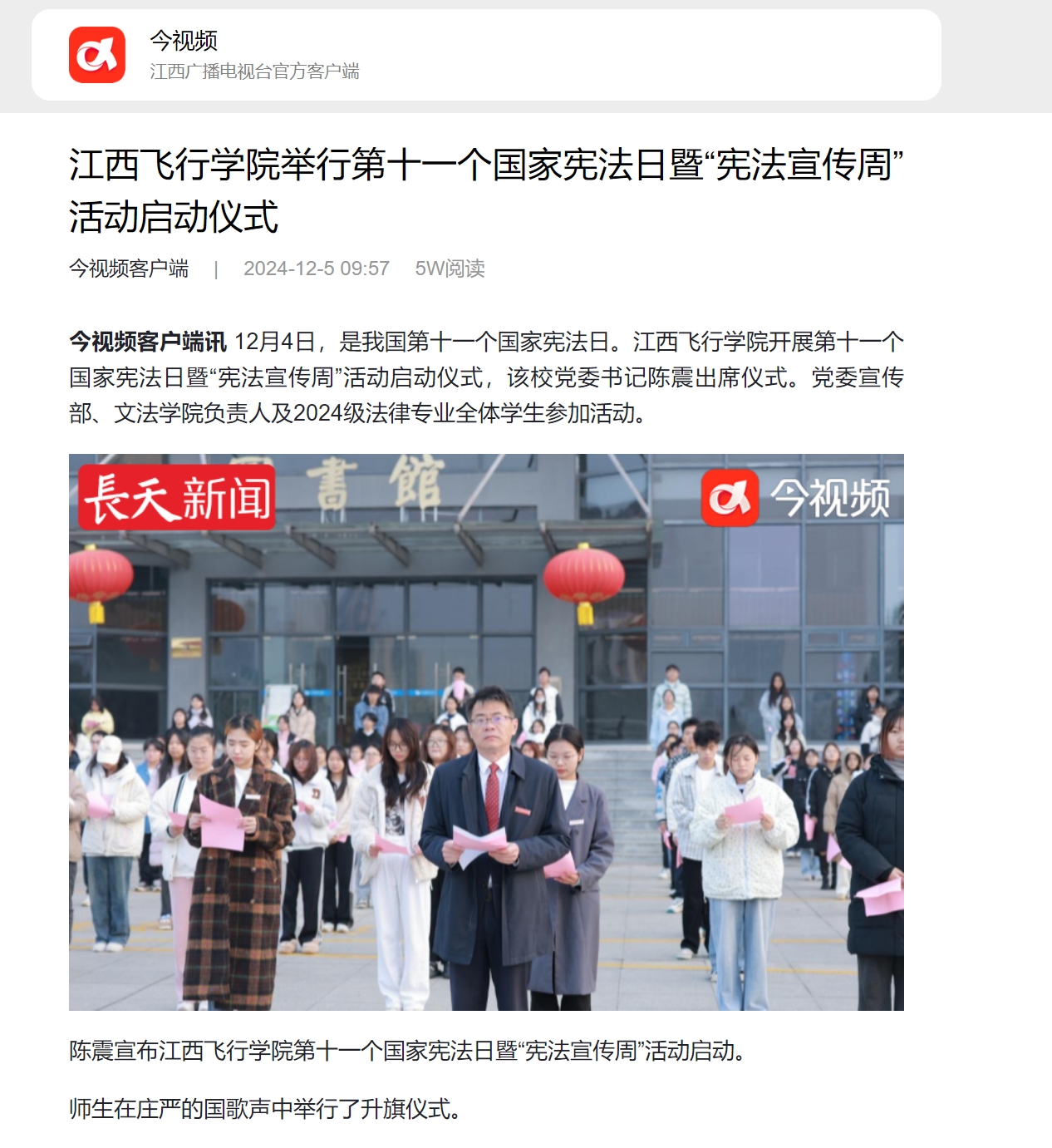 近日,今视频报道,江西飞行学院举行第十一个国家宪法日暨“宪法宣传周”活动启动仪式详情如下: