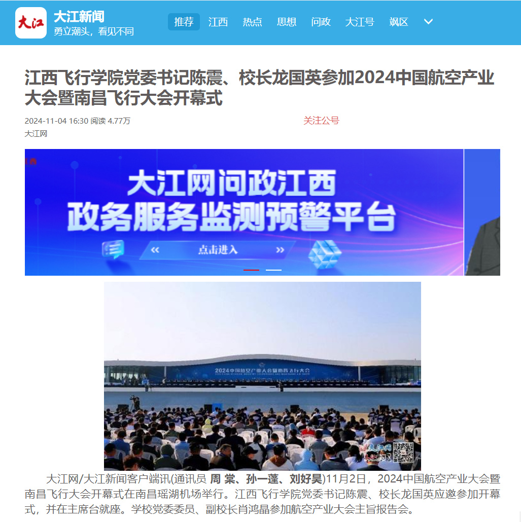 大江网:江西飞行学院党委书记陈震、校长龙国英参加2024中国航空产业大会暨南昌飞行大会开幕式