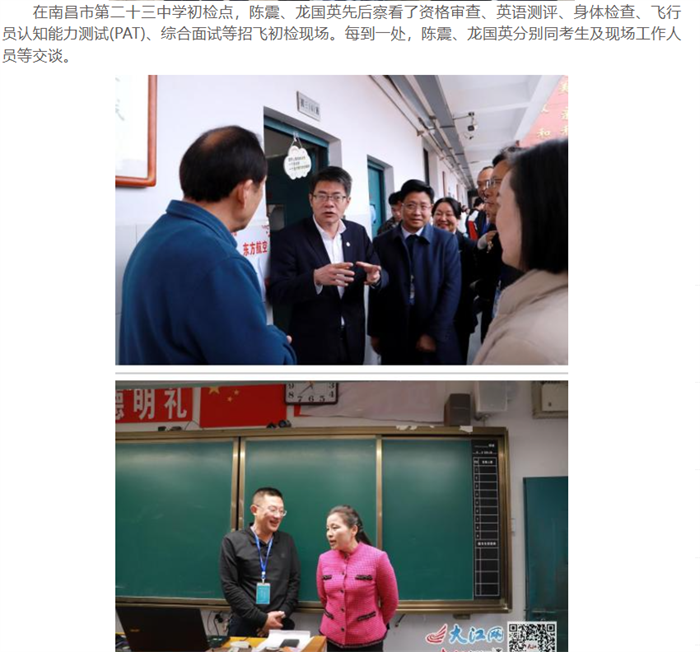 大江网:江西飞行学院党委书记陈震、校长龙国英现场指导学校首次招飞初检工作