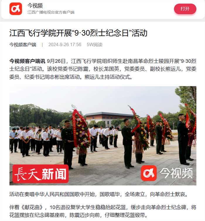 今视频报道,江西飞行学院开展“9·30烈士纪念日”活动。详情如下: