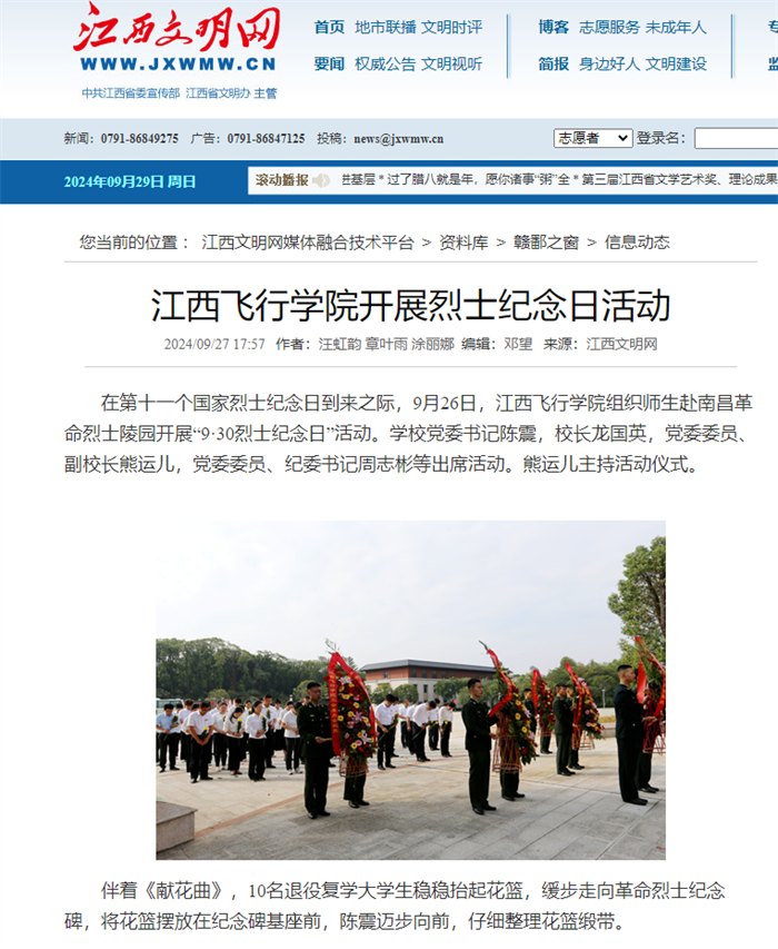近日,江西文明网报道,江西飞行学院开展烈士纪念日活动。详情如下: