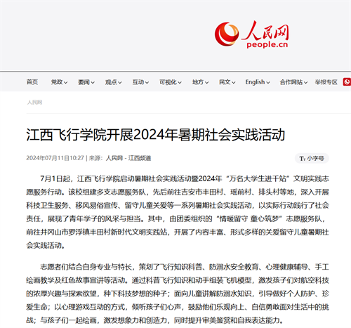 人民网:江西飞行学院开展“强国有我 青春有为”2024年“万名大学生进千站”文明实践志愿服务活动
