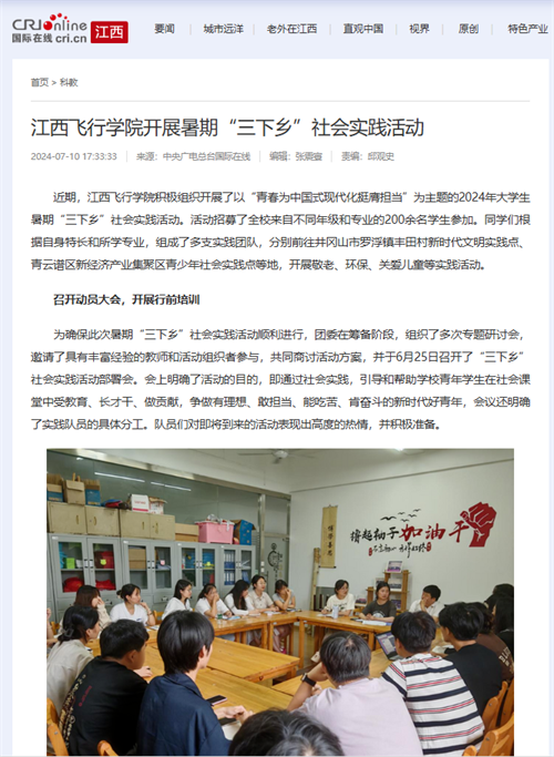 近日,中央广播电视总台国际在线报道,江西飞行学院开展暑期“三下乡”社会实践活动。详情如下: