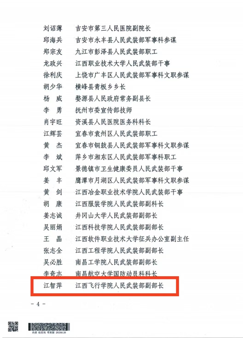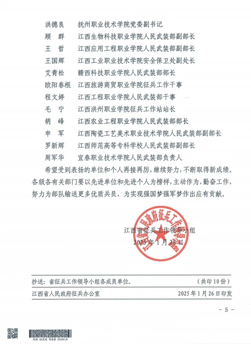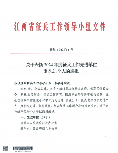 近日,江西省征兵工作领导小组印发《关于表扬2024年度征兵工作先进单位和先进个人的通报》(赣征〔2025〕6号),对圆满完成年度两季征兵任务的先进单位和个人进行表彰,我校学生工作部(处)长、人民武装部副部长江智萍同志被表彰为2024年度征兵工作先进个人。