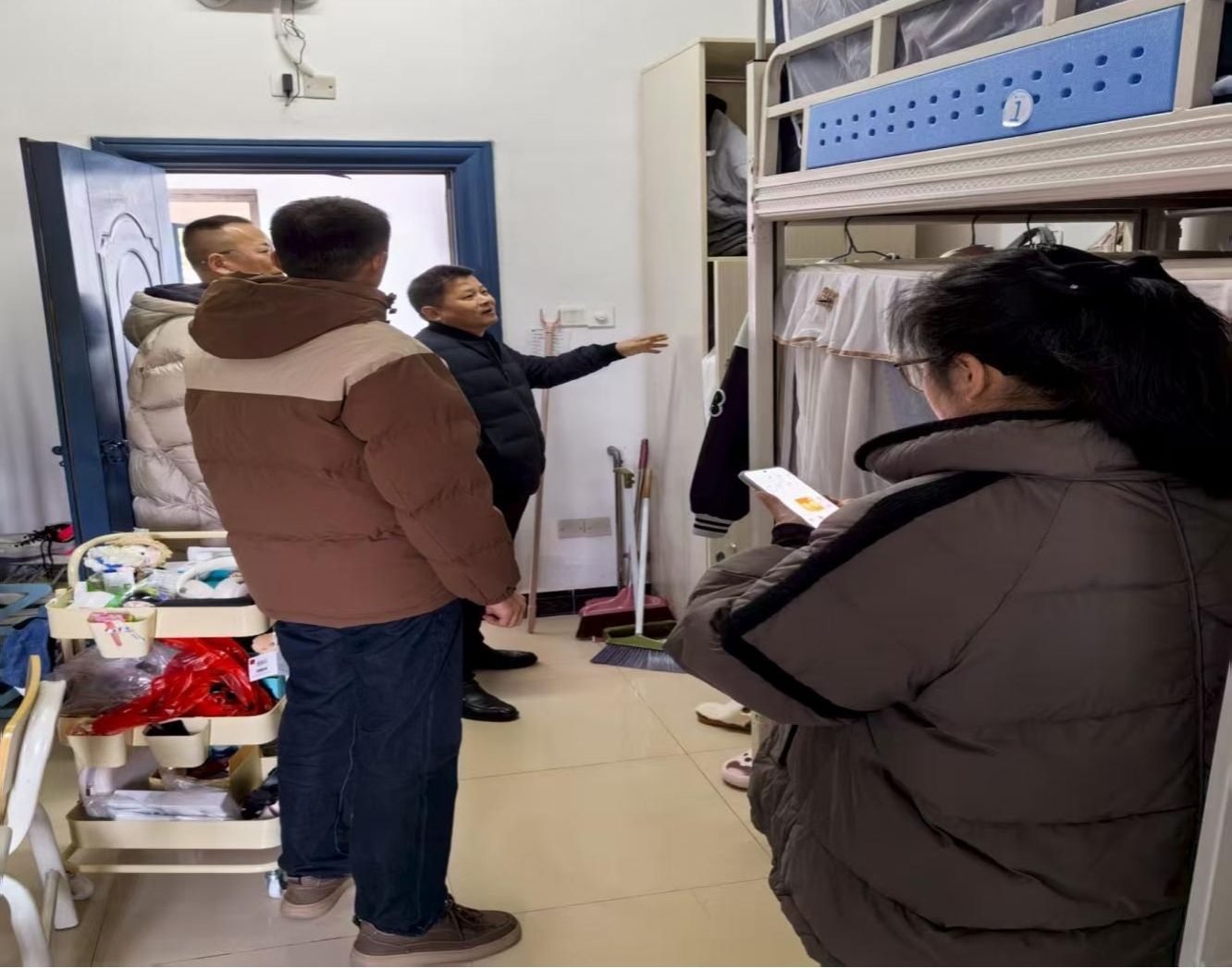 为切实解决学生宿舍储物难的问题,学工处全面排查统计没有立柜的宿舍,根据统计情况进行统一安装,把服务学生的举措落到实处。12月3日,学工处江智萍处长带领相关科室负责人,深入学生宿舍走访查看立柜安装情况。一行人实地查看立柜安装质量、稳固性及空间利用情况,新装立柜排列整齐、安装规范,储物空间充足,有效缓解了学生物品存放难题,并询问学生使用效果,安装了立柜的宿舍同学非常满意。