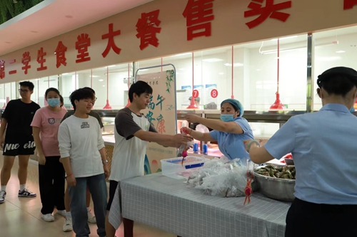 学校食堂还设专门位置为假期留校学生分发免费粽子和咸鸭蛋,领取现场秩序井然,学生们笑容满面。