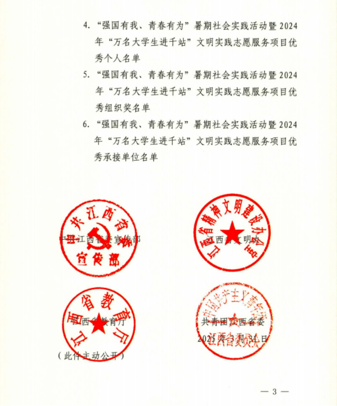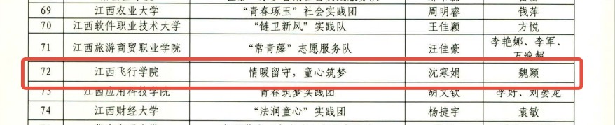 近日,江西省教育厅公布了关于“强国有我、青春有为”暑期社会实践活动暨2024年“万名大学生进千站”文明实践志愿服务活动的获奖名单。我校“情暖留守, 童心筑梦”团队荣获“优秀团队”荣誉称号,魏颖、黄玲玲两位老师荣获“优秀指导教师”荣誉称号,吴惊兰、姚骏阁荣获“优秀个人”荣誉称号。