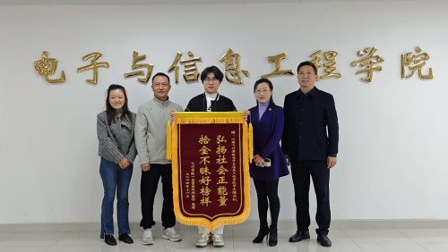 原来失主是一位在食堂工作的老阿姨,因不会使用微信,每个月领取现金工资,在晒被子时不小心丢失了装有现金的信封。失主钱款失而复得后激动不已,得知是学校的学生拾金不昧时,第一时间把锦旗送到学院,感谢陈奕帆同学,同时也感谢学校教育出满满正能量的大学生。