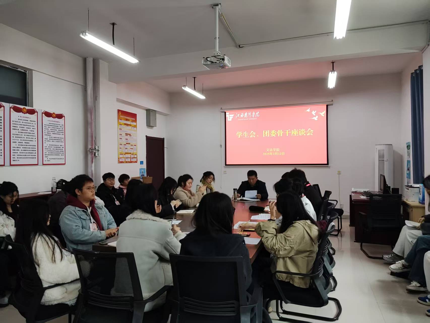 3月12日,文法学院在学院会议室召开学生会、团总支骨干工作座谈会。文法学院党总支书记曹国平、全体辅导员、学生会及团委学生骨干参加会议。