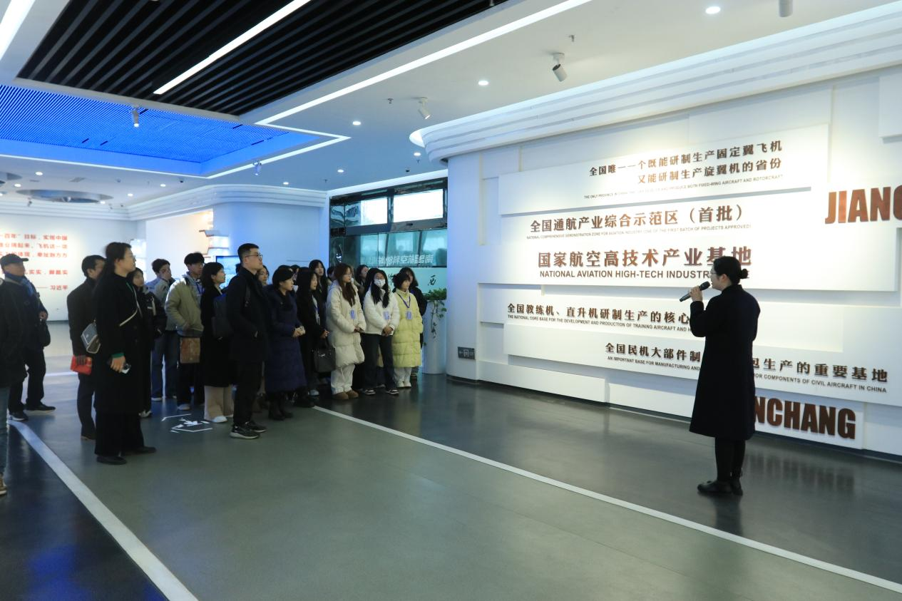 在南昌航空工业城讲解员的引导下,师生依次参观了“艰辛求索 航空救国”“孕育摇篮 航空报国”“使命担当 航空强国”三大主题展区。展区内陈列的国产飞机等比例模型,以及航空发动机、无人机系统等核心部件,生动展现了我国航空工业从无到有、从弱到强的辉煌历程。