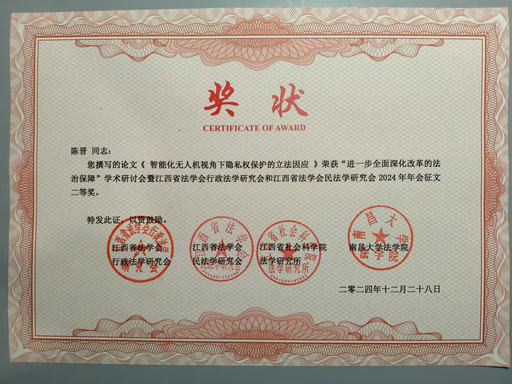 省民法学研究会常务理事、文法学院法律教研室主任陈晋副教授受邀参加此次研讨会,其撰写的论文《智能化无人机视角下隐私权保护的立法因应》荣获年会征文二等奖。