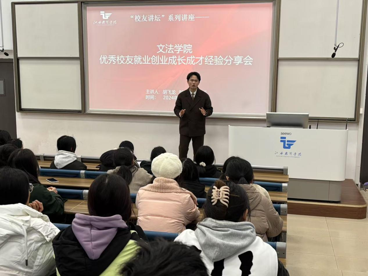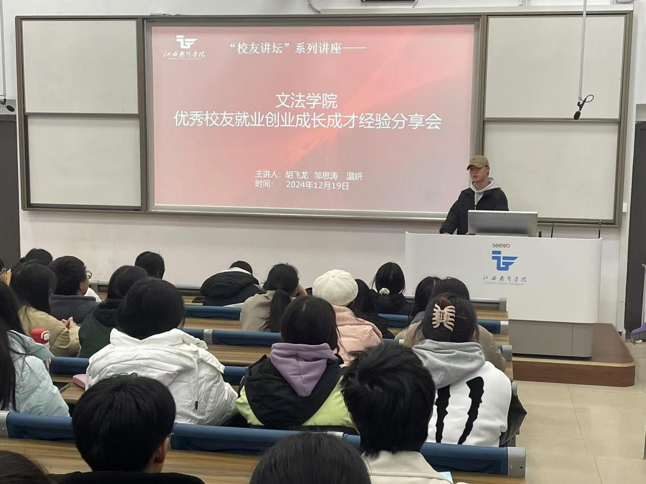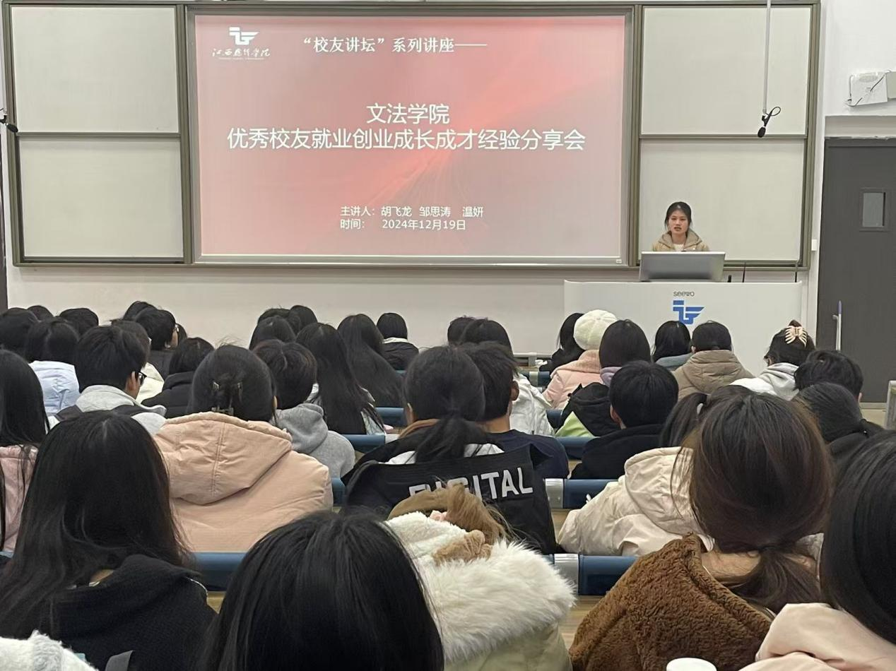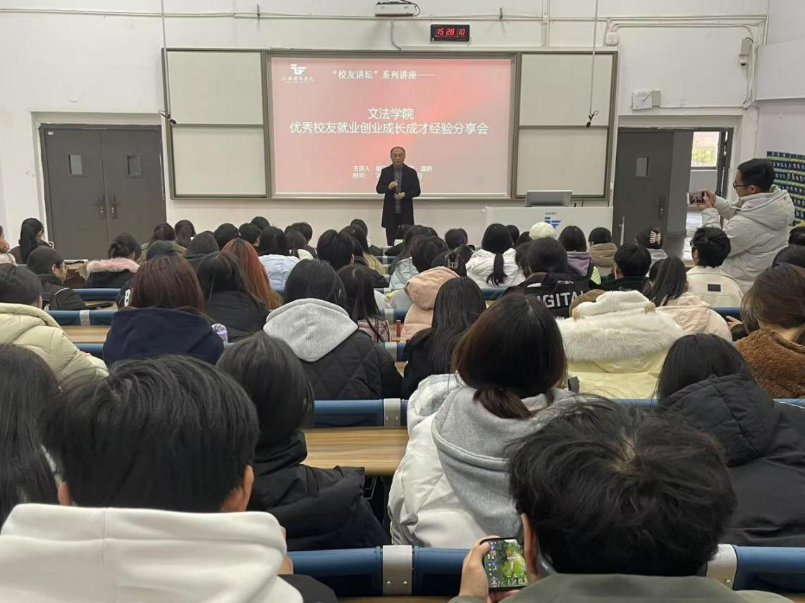 2024年12月19日,文法学院在一教阶梯教室举办优秀校友成长成才经验分享会。活动会由文法学院法律教研室主任陈晋主持,2024级法律事务专业学生约130人参加。