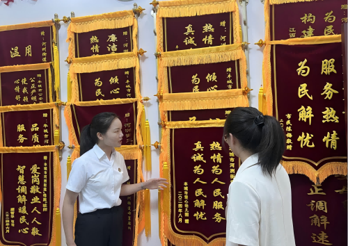 调研第一站,教师们来到丰城市公安局河洲派出所,参观了“母舅驻所调解室”,通过介绍了解队伍构成、运行机制以及具体成效。“母舅”调解员的加入大力推动非警务警情分流联动,着力构建矛盾纠纷多元化解、基层社会协调共治新模式,确保“纠纷进了门,件件有人管”,实现“小事不出村、大事不出镇、矛盾不上交”。对当下社会纠纷化解、家庭和睦、社会和谐具有极强的现实意义。