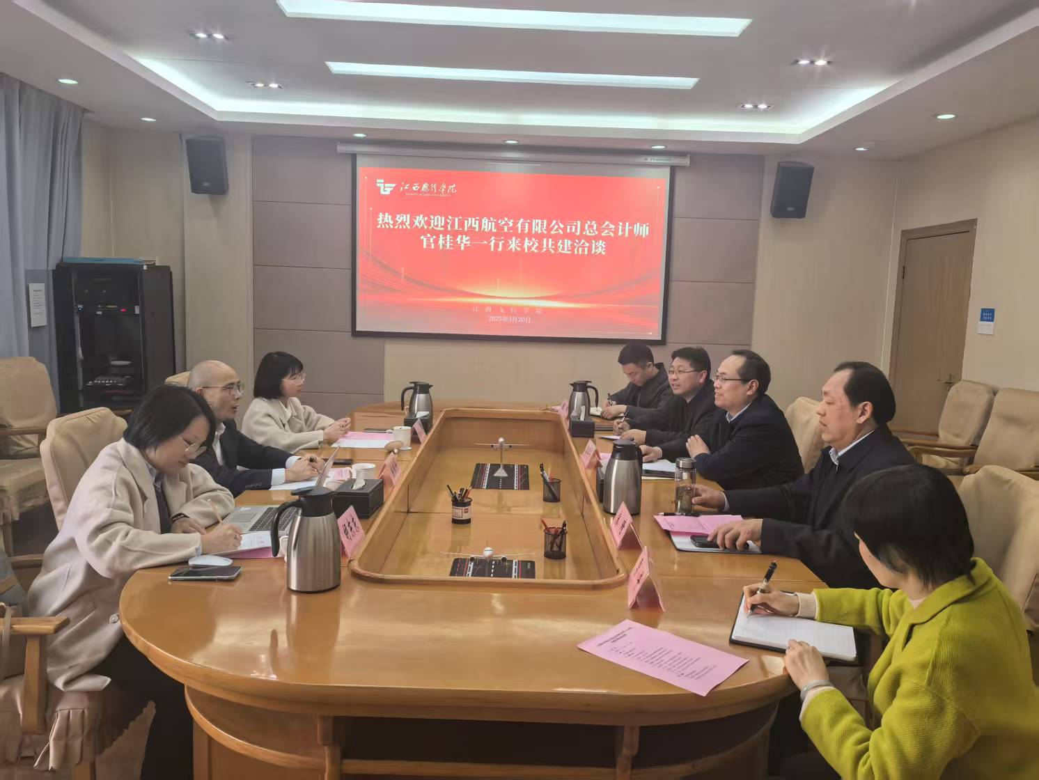 2025年3月20日下午,江西航空有限公司总会计师官桂华一行莅临江西飞行学院,就产业学院共建事项进行深入座谈交流。校党委委员、副校长郭军华出席会议,总飞行师宋琦、科研处、飞行技术学院负责人参加。